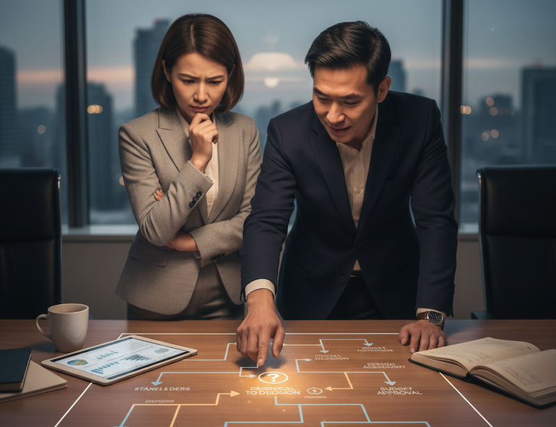 你不知道他們在糾結什麼。你不知道是誰在卡關。你不知道對方的窗口,有沒有能力在他自己的老闆面前把這個案子說清楚。